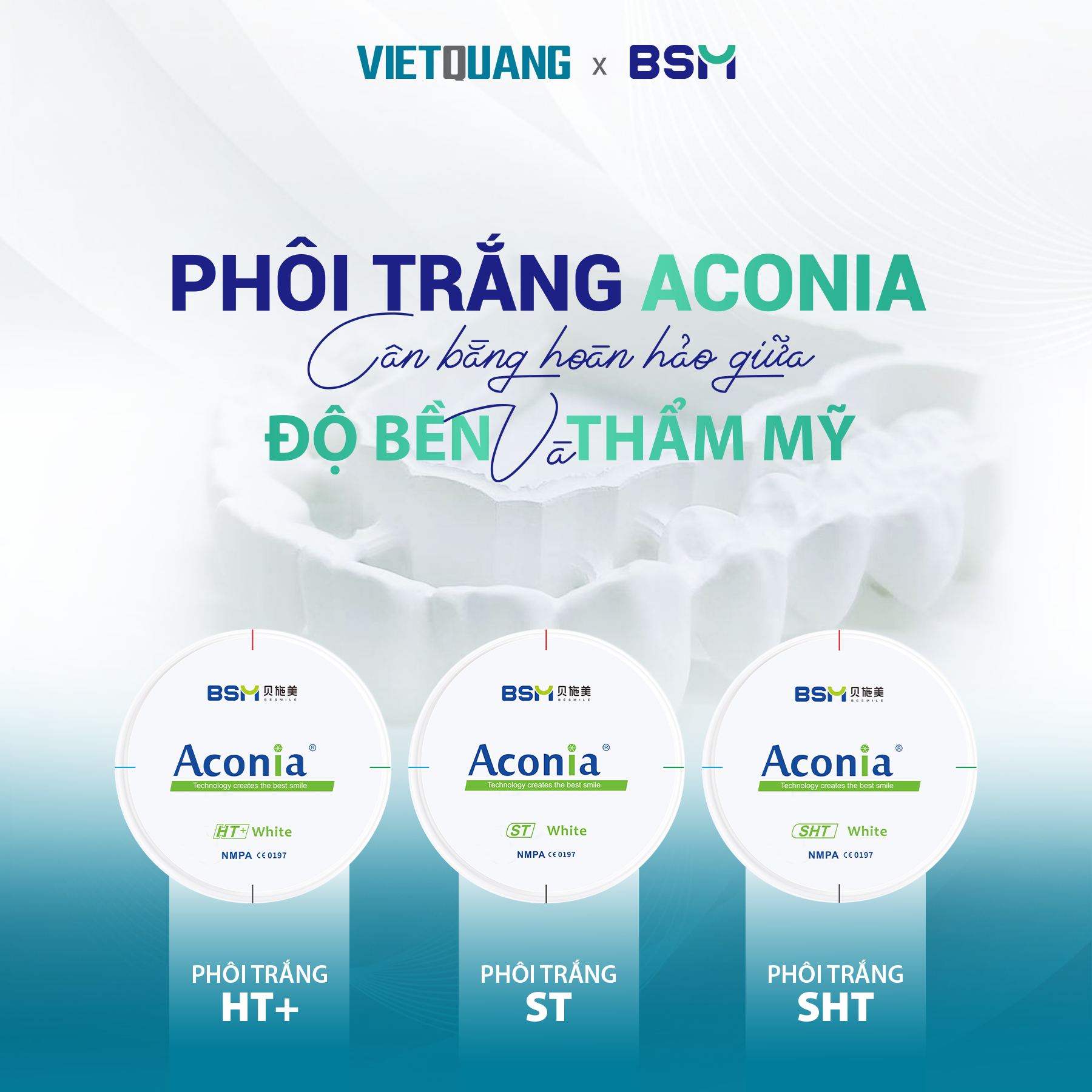 Phôi Trắng Aconia đến từ thương hiệu BSM hứa hẹn mang đến sự cân bằng hoàn hảo giữa độ bền vượt trội và tính thẩm mỹ cao, đảm bảo sản phẩm cuối cùng chính xác và bền vững theo mọi yêu cầu lâm sàng. Phôi Trắng Aconia được phân loại rõ ràng theo độ bền uốn và độ trong suốt, bao gồm các dòng 𝗦𝗧, 𝗛𝗧+, 𝗦𝗛𝗧, giúp Quý Kỹ Thuật Viên thao tác nhanh chóng và chính xác.